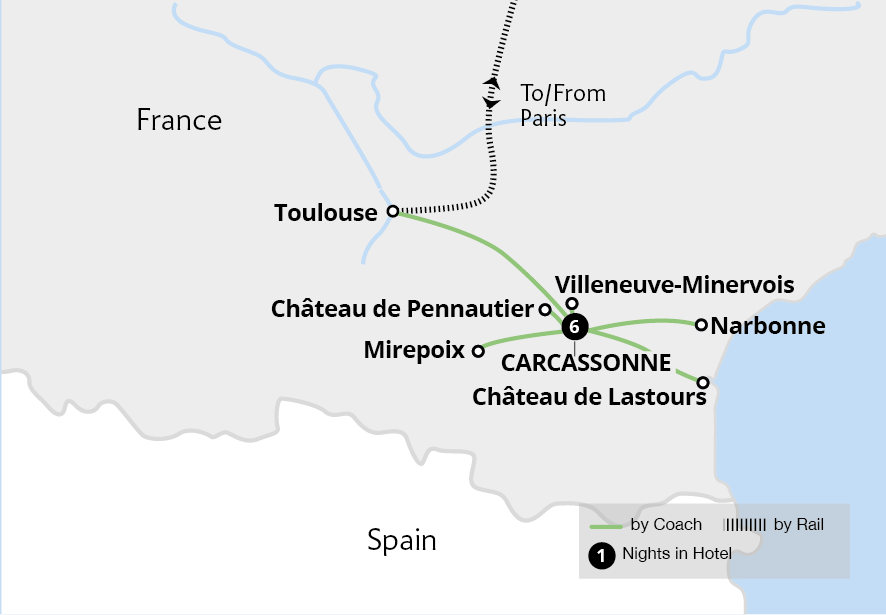 • Explore the medieval fortress of Carcassonne and the Châteaux de Lastours