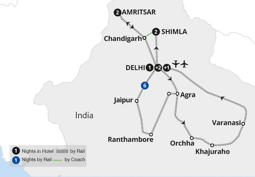 Retrace the steps of Indian princes aboard the Maharajas' Express - one of the world's most luxurious trains. Starting and ending in Delhi, this incredible voyage of discovery visits the former colonial summer capital of Shimla before showcasing spellbinding Amritsar as we witness the Wagah Border Ceremony and the Palki procession at the Golden...